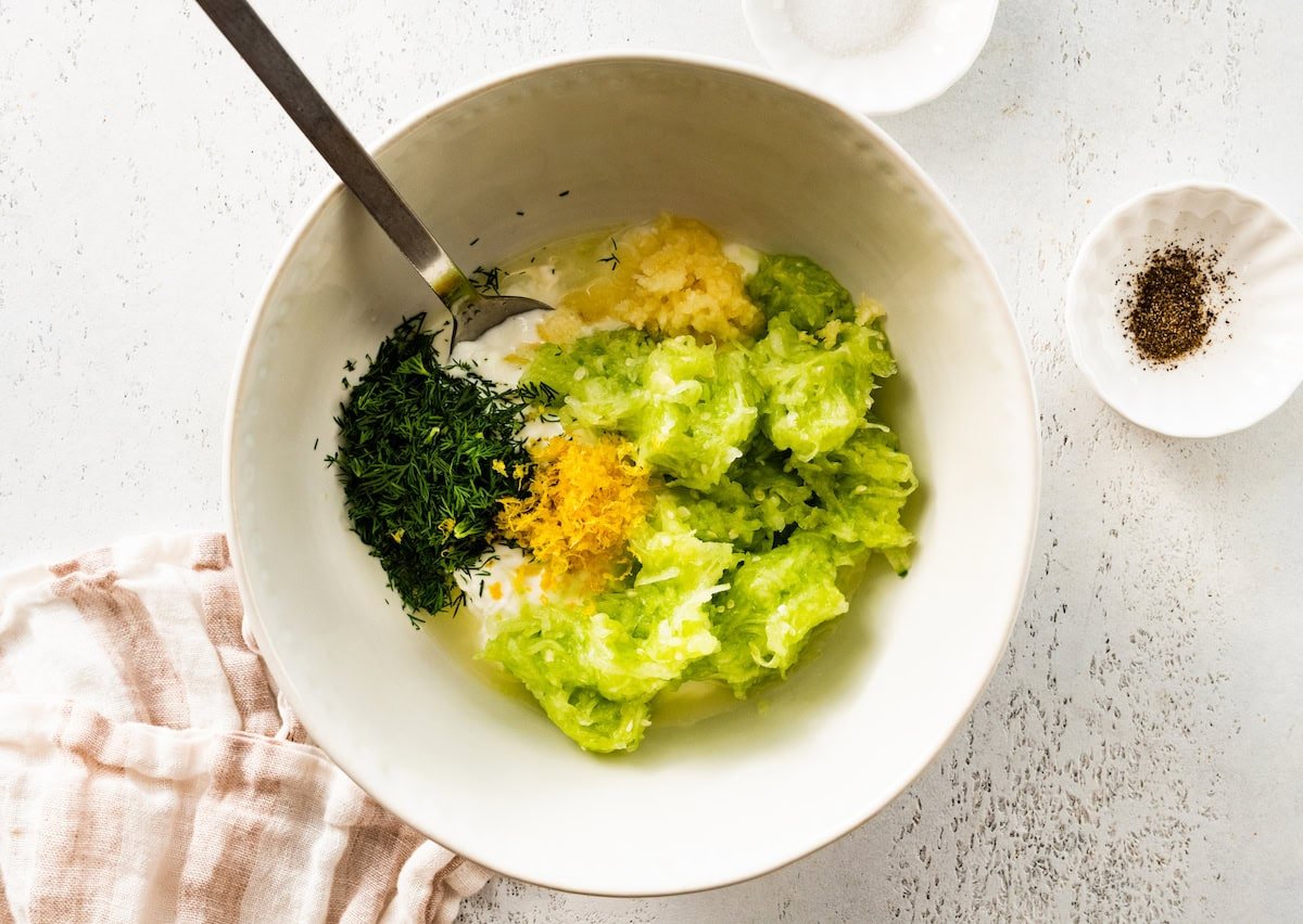- Peel and grate your cucumber if you haven’t already. Squeeze as much liquid out of the cucumber as you can with paper towels before adding it to the rest of the ingredients.