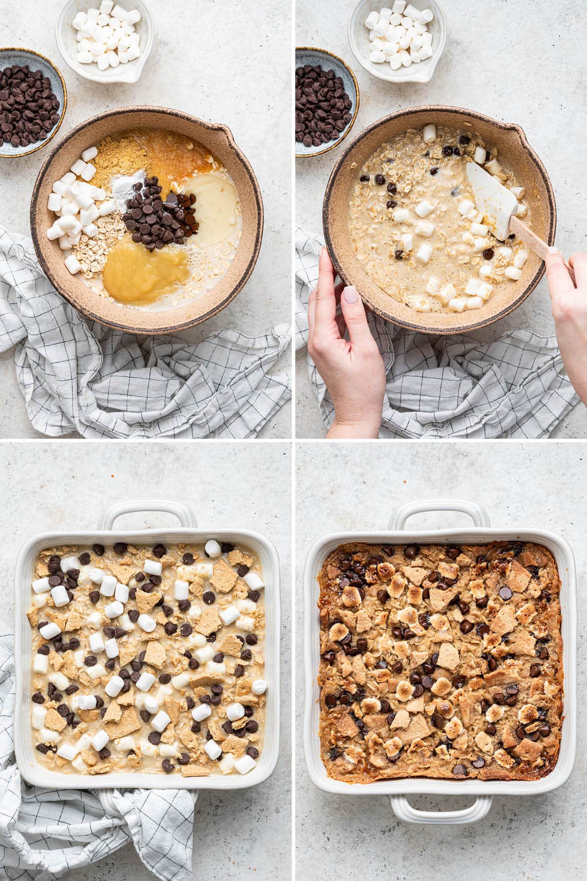 Preheat the oven to 375°F and spray an 8×8 square baking dish with cooking spray. Combine oats, milk, maple syrup, baking powder, sea salt, flaxseed, coconut oil, applesauce, vanilla, ¼ cup chocolate chips and ¼ cup marshmallows in a large mixing bowl. Stir to combine using a spatula.
