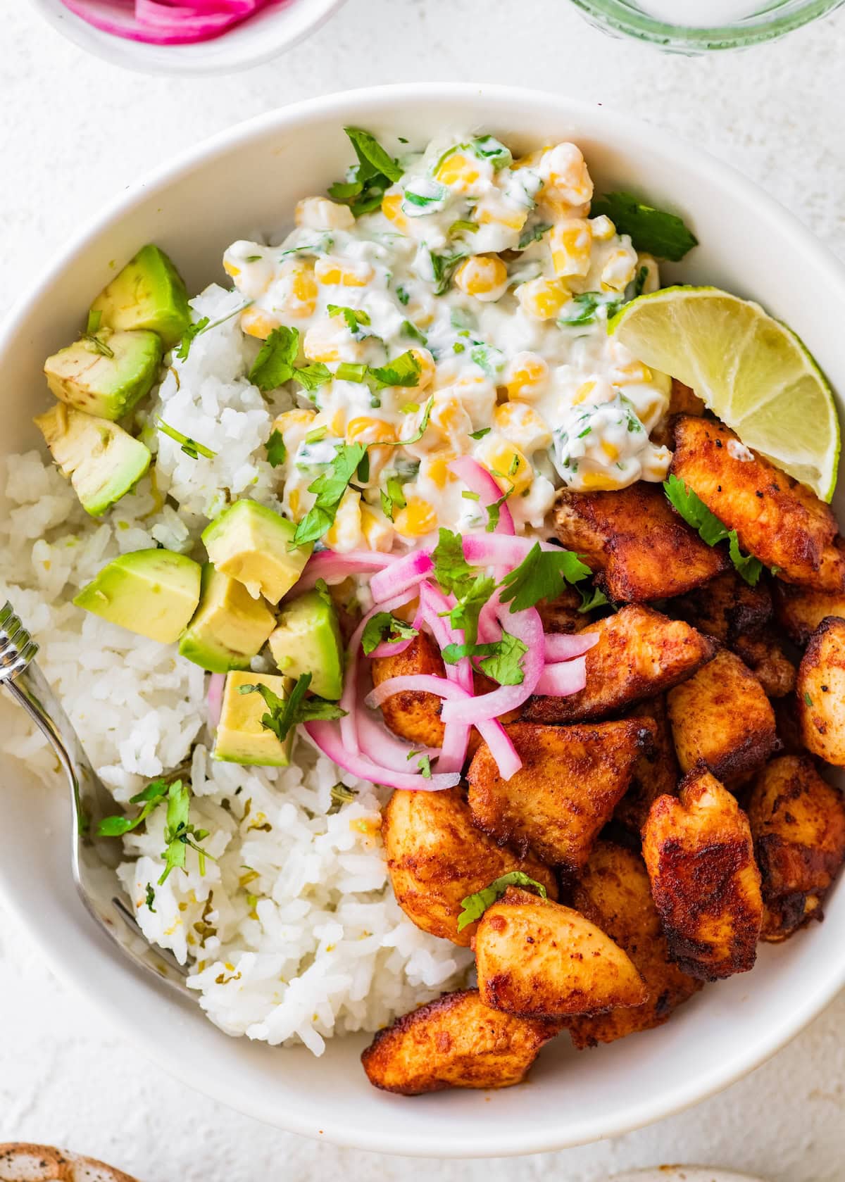 - Top each bowl with chicken chunks. Add a generous scoop of the Mexican street corn to the bowl. Add avocado, pickled red onions (or fresh red onions), cilantro, a sprinkle of crumbled cotija cheese and a squeeze of fresh lime juice, if desired.1 avocado, Pickled red onions or fresh red onions, Cilantro, Cotija cheese