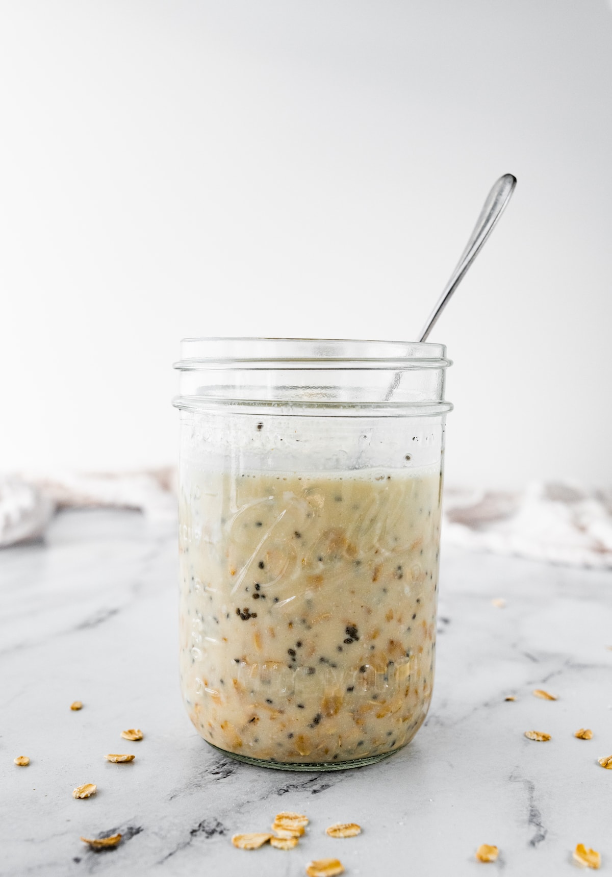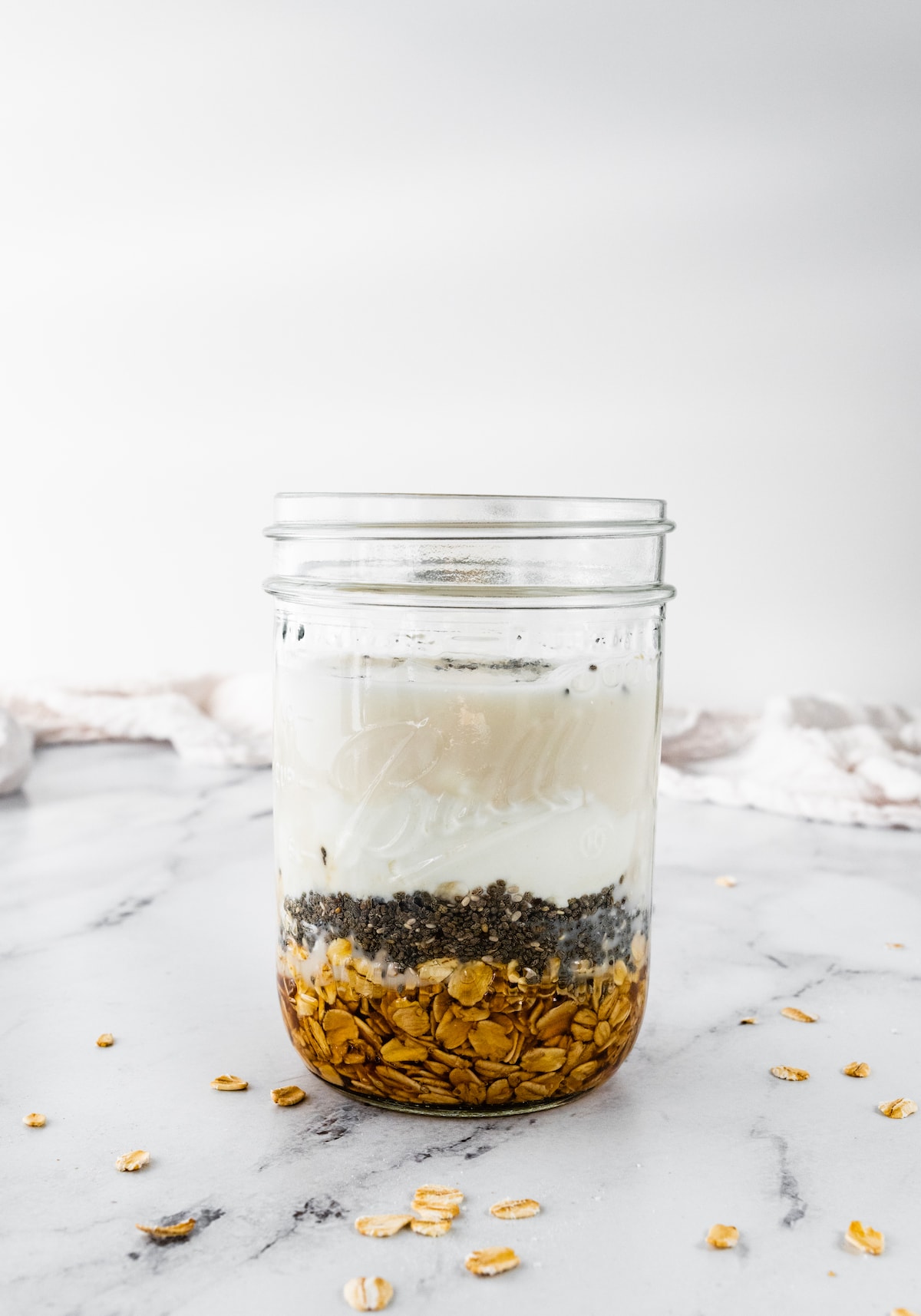 The base “recipe” for overnight oats is so simple! I recommend a 1:1 ratio of rolled oats to milk, plus half as much yogurt. So for 1/2 cup of oats, I use 1/2 cup of milk + 1/4 cup of yogurt (or an additional 1/4 cup of milk). These proportions seem to give the oats the perfect consistency, not too thick, but not soupy.