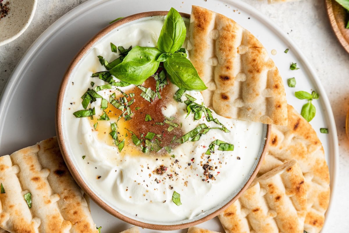 - Pita bread – A classic pairing with whipped feta dip! Homemade pita or store-bought, warmed pita are both great options. The pita bread helps to scoop up the dip, making it easier to enjoy.